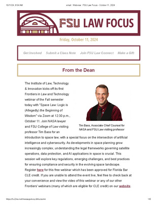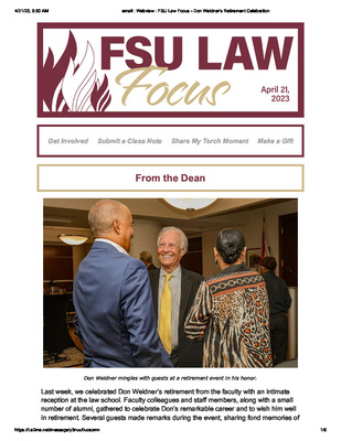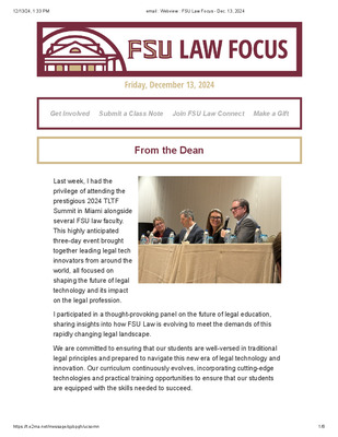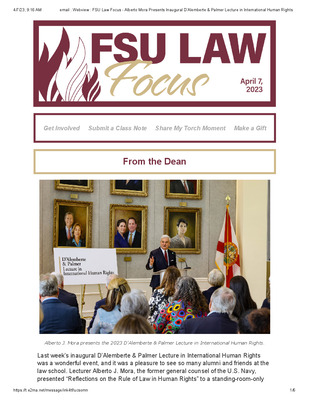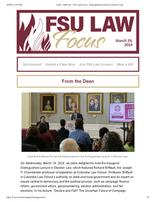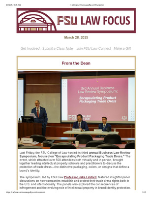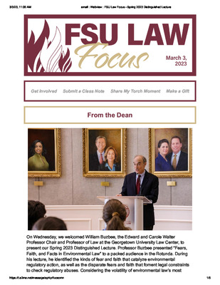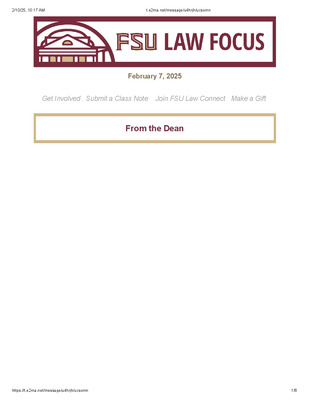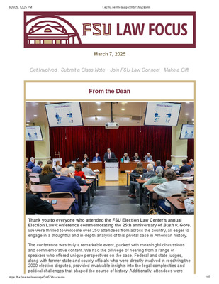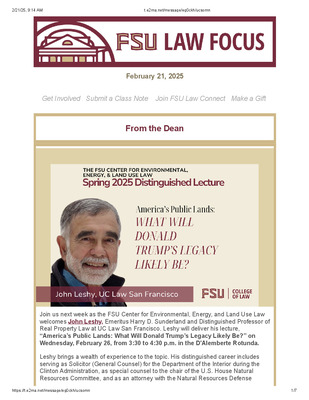 From the Dean: FSU Center for Environmental, Energy, and Land Use Law Spring 2025 Distinguised Lecture - John Leshy; FSU Law in the News: D'Alemberte & Palmer Lecture; Frontiers in Law and Technology; Faculty In The News: Jacob Eisler; Faculty In The News: Jake Linford; Student Profile: 3L Melissa Canaan