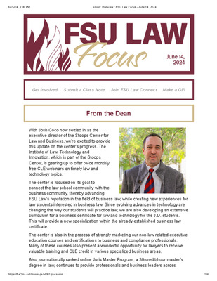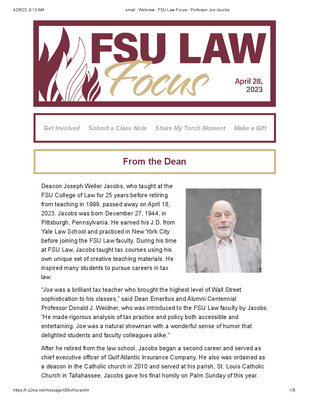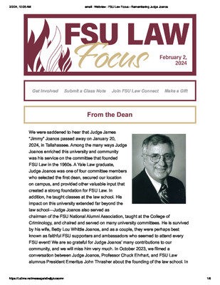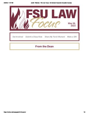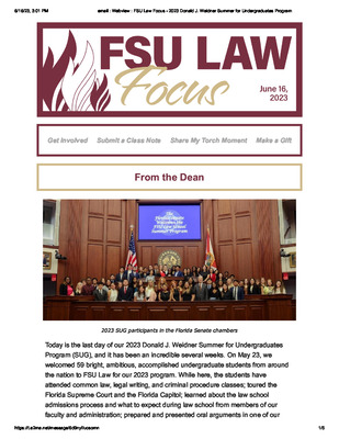 From the Dean: Remembering President John E. Thrasher; FSU Law News (Summer for Undergraduates); FSU Law Faculty News (Larry Krieger); Frontiers in Law & Technology