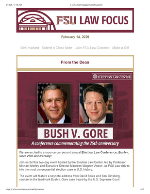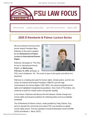 From the Dean: Election Law Conference, Bush v.Gore 25th Anniversary; Florida Speaker of the House Visits FSU Law Class; Former Ireland President Mary Robinson Delivers Powerful Lecture; FSU Law Hosts Regional National Trial Competition; 2025 Business Law Review Symposium Rescheduled; Faculty News: Darby Kerrigan Scott Announced as Co-Director of PILC; Student Profile: 3L Daniela Mulero Morales