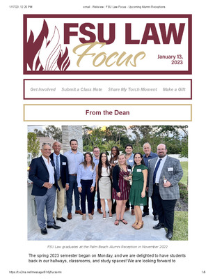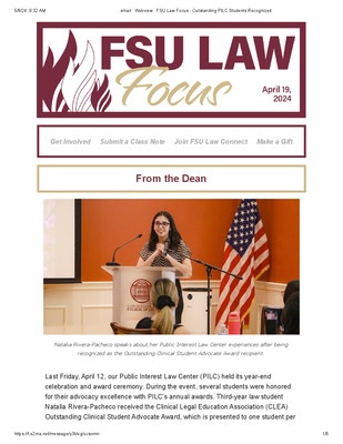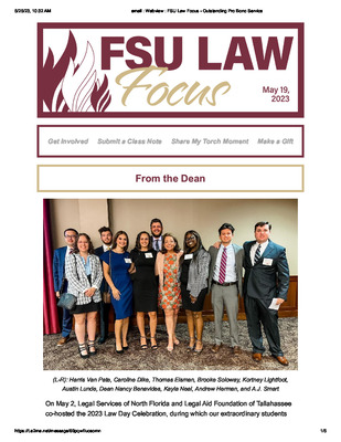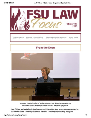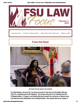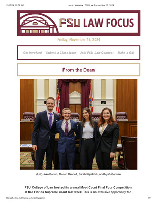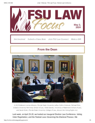From the Dean: Students at the legislature; FSU Law News (FSU Law Election Law Center); 2025 Florida Bar Convention; FSU Faculty Spotlight: Justin Sevier; FSU Law Student News (Samantha Joles)
