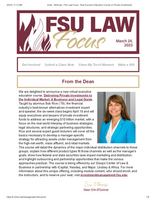 From the Dean: Business Law Review Symposium ("Encapsulating Product Packaging Trade Dress"); In Memoriam: Michael Halpern ('76); Faculty in the News: Michael Morley; Faculty in the News: Jacob Eisler; FSU Law in the News: Alternative Spring Break; Book Talk: Daniel Solove, "On Privacy and Technology”; Alumni News: Alexcia Cox ('05); Alumni News: Laverne Lewis Gaskins ('93); Alumni News: Kat Klepfer ('14)