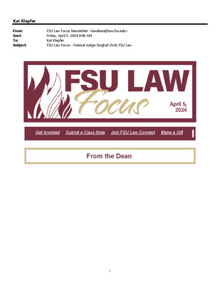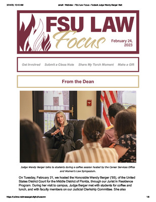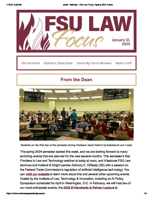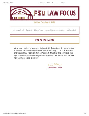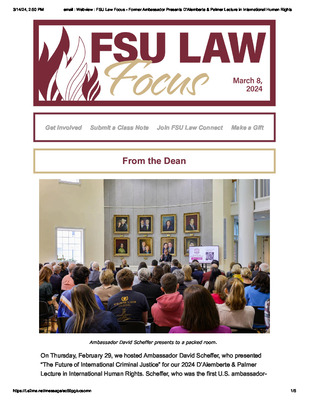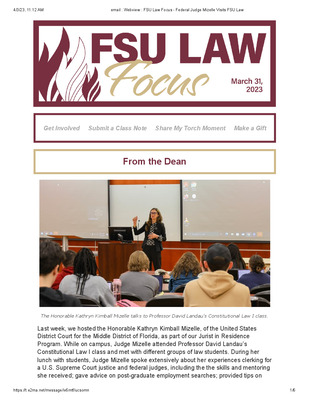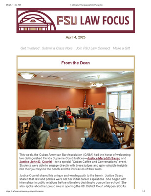 From the Dean: Judge Visits to Campus (Julie Sneed, Stephanie Ray); Don't Miss It: D'Alemberte & Palmer Lecture inInternational Human Rights; Spring 2025 Distinguished Environmental Lecture; Alternative Spring Break; Frontiers in Law and Technology Webinar; FSU Law in the News