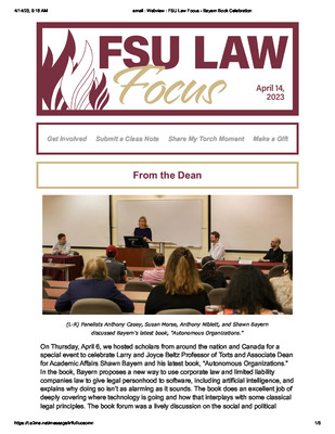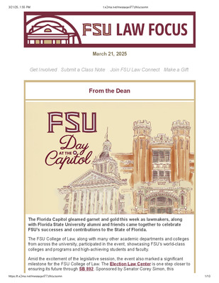 From the Dean: FSU Day at the Capitol; Book Talk: Professor Shawn Bayern; Faculty News: Professor Rima Nathan; 2025 Alternative Spring Break; FSU Law in the News; Frontiers in Law and Technology; Faculty News: Professor Jacob Eisler; Alumni in the News: Honorable Nikki Clark ('77); Student Profile: 3L Alyssa Gagnon