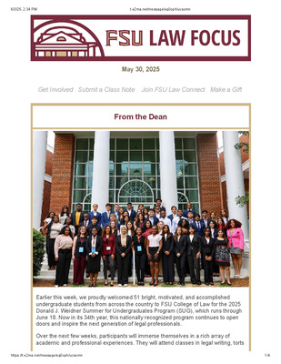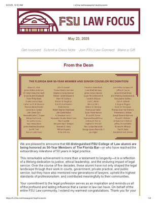 From the Dean: Summer for Undergraduates 2025; FSU Law Faculty News (Henry Zhuhao Wang); FSU Alumni News (Sean Donahue); FSU Alumni News (Florida Bar 50-Year Member andSenior Counselor Recognition honorees)