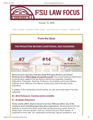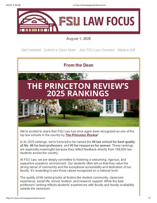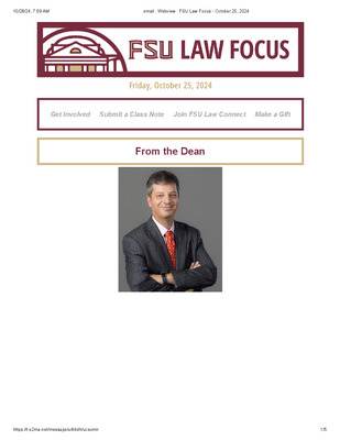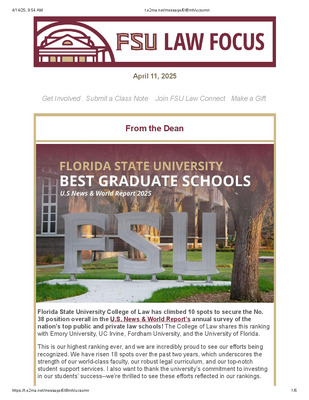 From the Dean: U.S. News & World Report rranking increase; Preview Day 2025; FSU Law in the News; Alumni News: Miguel de la O ('89); Student Feature: 3L Ashvi Luthra
