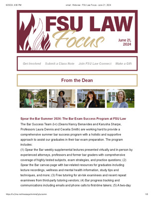 From the Dean: 2025 Florida Bar Convention (Illuminating Justice: 75 Years of Shining Brightly); FSU Law News: Florida Summer for Undergraduates; FSU Law Faculty Spotlight: Maureen Wagner Vinson; FSU Law Alumni News