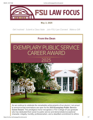 From the Dean: Exemplary Public Service Career Award; 2025 Spring Commencement; FSU Law Faculty in the News; Frontiers in Law and Technology; FSU Law Student News (Tazara Fields, Lauren Evens)