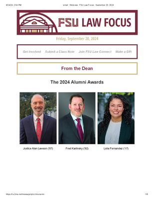 From the Dean: Annual Fund Campaign 2024-25; FSU Law News (Summer for Undergraduates); FSU Law in the News (Juvenile SolitaryConfinement Project); FSU Law Alumni News (Katie Maniglia); Graduate Profile: Morgan Gliner