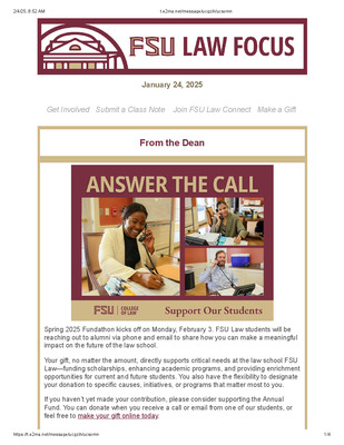 From the Dean: Answer the Call (Spring 2025 Fundathon); FSU Law in the News; Faculty in the News: Larry Kreiger