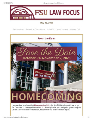 From the Dean: Save the Date for Homecoming; FSU Law Alumni News (Alumni recognized by VHFCNBA); FSU Law Student News (William Blake)